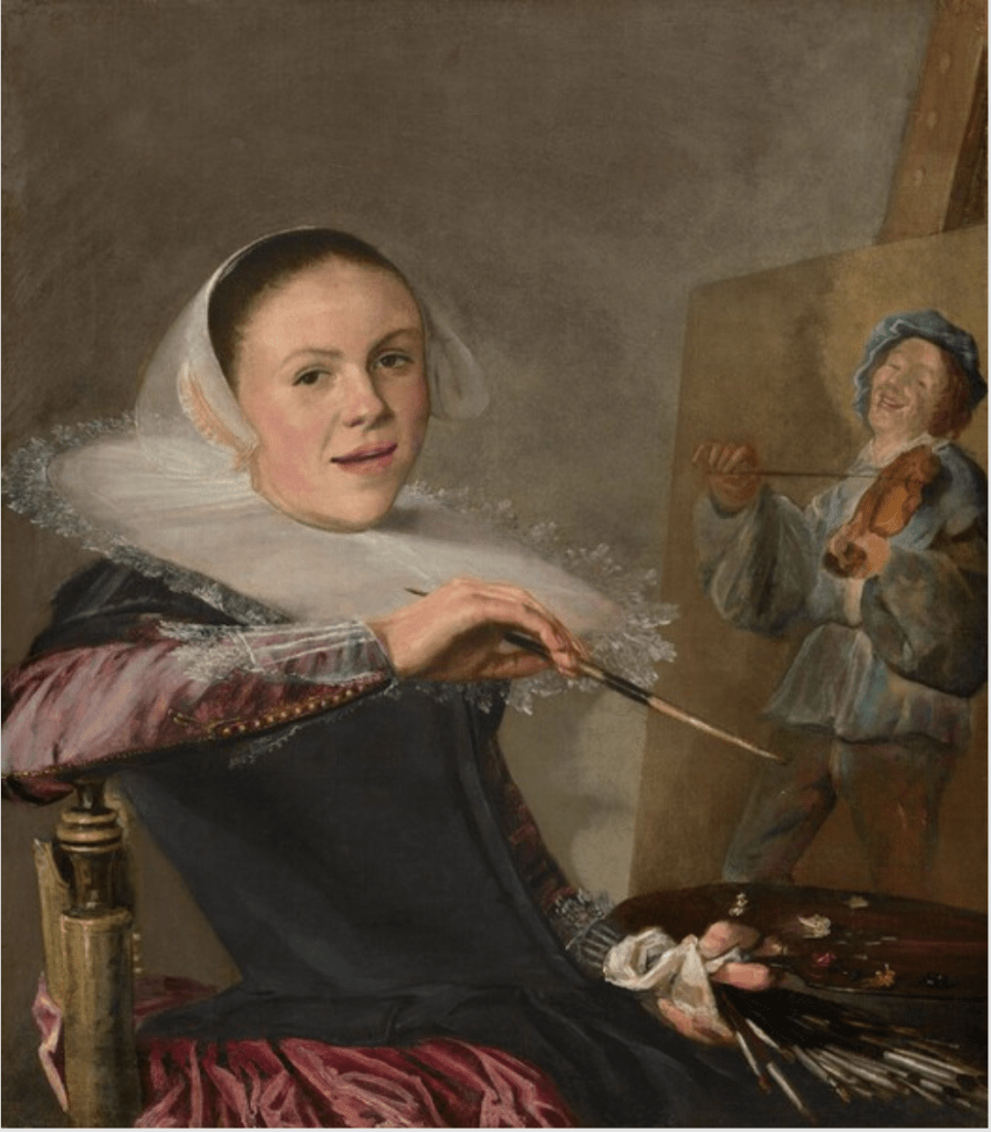 Judith Leyster’s Self-Portrait exudes self-confidence in her abilities, and it has become one of the National Gallery of Art’s most popular Dutch paintings. Leyster has depicted herself at her easel, briefly interrupting work on a painting of a violin player to interact with the viewer. The momentary quality of the portrait and the vigorous brushwork echo the work of Frans Hals (c. 1582/1583–1666), Haarlem’s most celebrated portrait painter and Leyster’s colleague. By juxtaposing her hand holding a brush with the hand and bow of the violin player, Leyster cleverly compares the art of creating ephemeral music with the art of creating timeless paintings. She holds the tools of her trade—a palette, a cloth, and no fewer than eighteen brushes. In reality she would not have worn the elegant dress and lace-trimmed collar while at work in her studio.